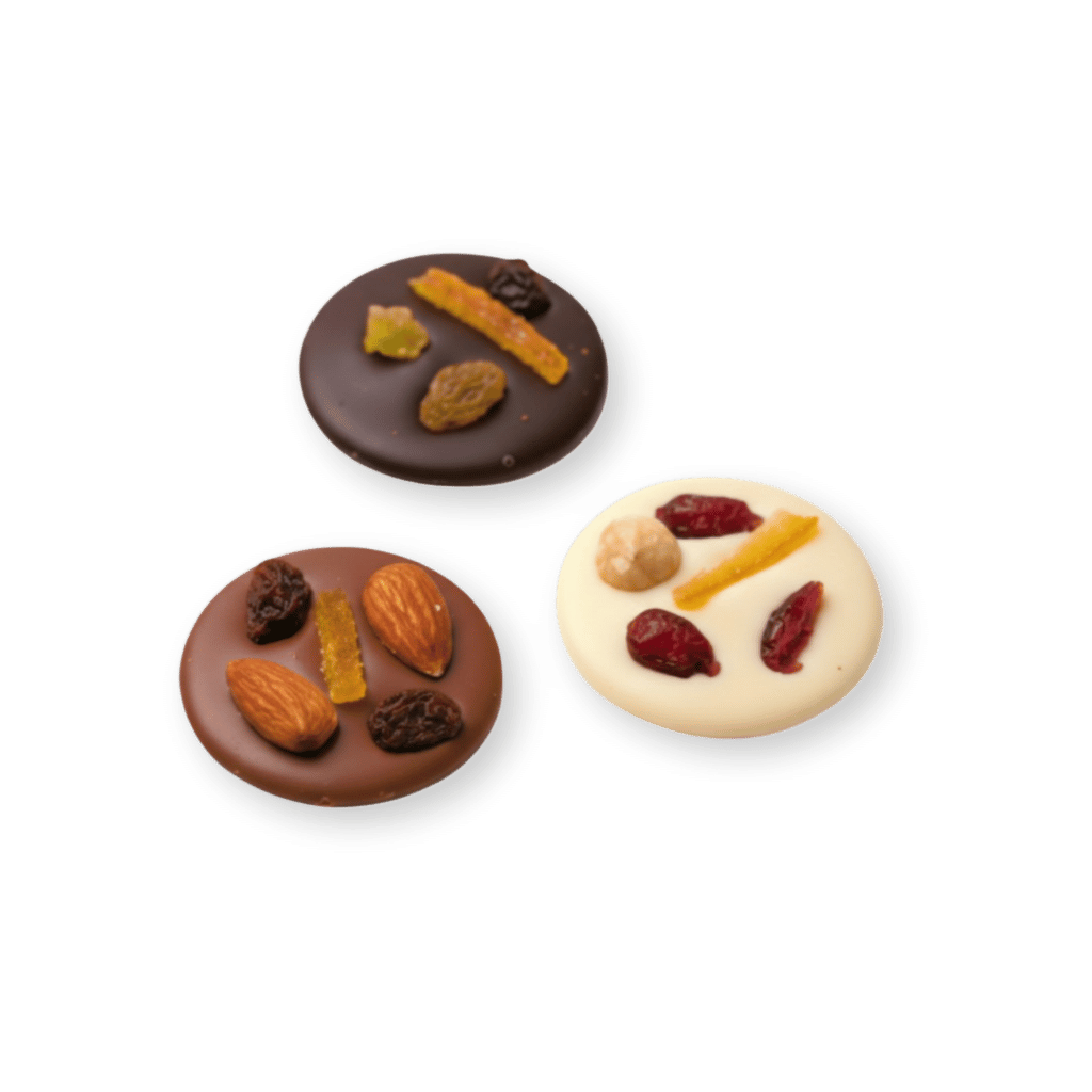 Each piece features a hand-selected assortment of candied fruits and premium nuts, including almonds, pistachios, cashews, and pecans, elegantly arranged on a disk of rich chocolate — available in dark, milk, or white chocolate.